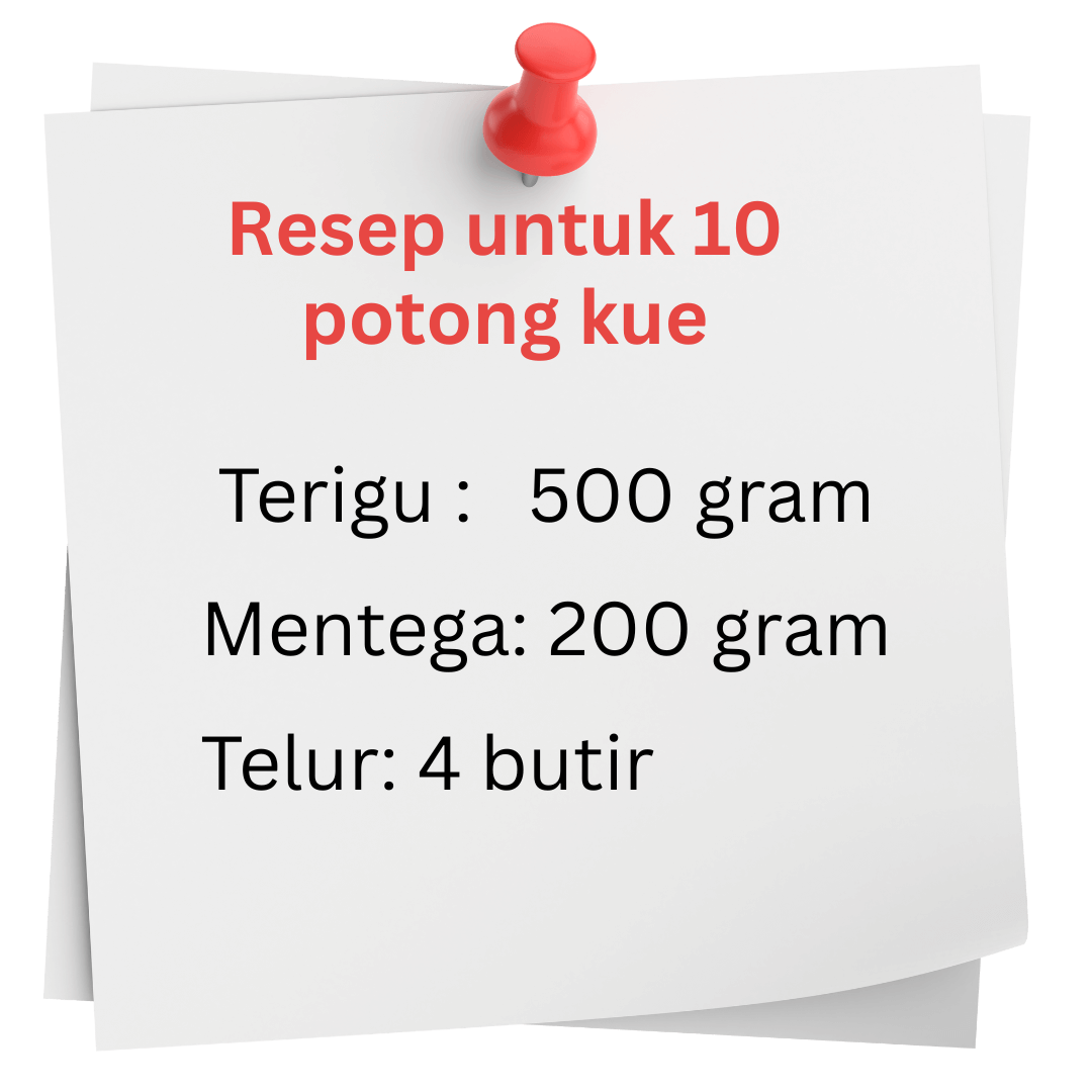 1. Lala akan membuat 25 potong kue. Resep yang dipakai Lala adalah seperti pada gambar. Resep tersebut untuk 10 potong kue. Harga bahan kue adalah sebagai berikut: