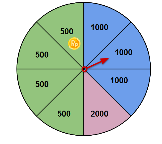 1. Untuk memotivasi orang sering belanja, situs lokapasar (marketplace) “belilagi” membuat promosi sebagai berikut. Tiap satu pesanan, pembeli berkesempatan memutar roda hadiah seperti pada gambar ini. Bila panah berhenti pada warna hijau, pembeli akan mendapatkan koin Rp500, bila berhenti pada warna biru, koin yang didapat adalah Rp1.000, dan bila berhenti pada warna pink, koin yang diperoleh adalah Rp2.000.
